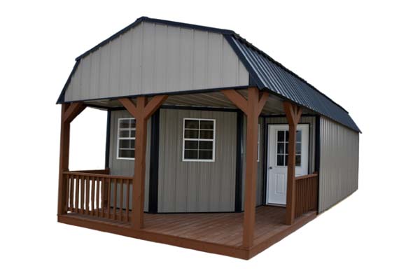 The Deluxe Lofted Barn Cabin comes standard with a wrap- around front porch with rails. Porch depth is included in length measurement.