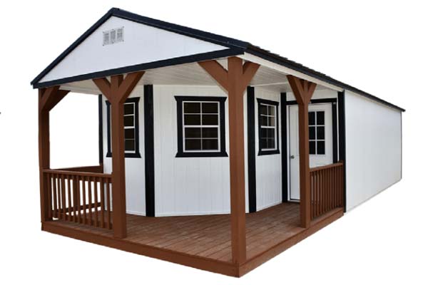 The Deluxe Cabin comes standard with a wrap-around front porch with rails. Porch depth is included in length measurement.